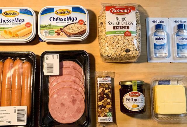 独立包装的芝士肠、烟熏火腿各两盒,都是真空无菌包装,不用担心变质,还有无糖燕麦片、坚果能量棒、便携装的果酱和黄油,甚至连迷你装的饮用水滤片都带上了,就怕中国的饮用水不合口味。